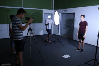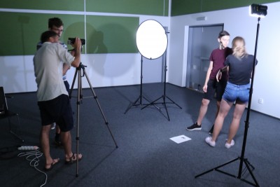 A teď si ukážeme základní nasvícení. Pokud potřebujeme natáčet člověka před nějakým pozadím, je třeba ho nasvítit tak, aby bylo pozadí osvětleno, ideálně rovnoměrně, ale zároveň na pozadí nevznikaly stíny. To se dociluje nasvětlením, kterému se říká kontra. To v podstatě smaže stíny vzniklé nasvícením obličeje figuranta. Teď si to zkusíme. Jeden z vás se stane figurantem. Další dva budou obsluhovat světla a poslední z vás si nastaví kameru na stativ a bude sledovat záběr a společně se pokusíte postavu nasvítit tak, aby záběr vypadal dobře. Já vám v tom samozřejmě budu nápomocen. Prochází, komentuje, ukazuje, radí.